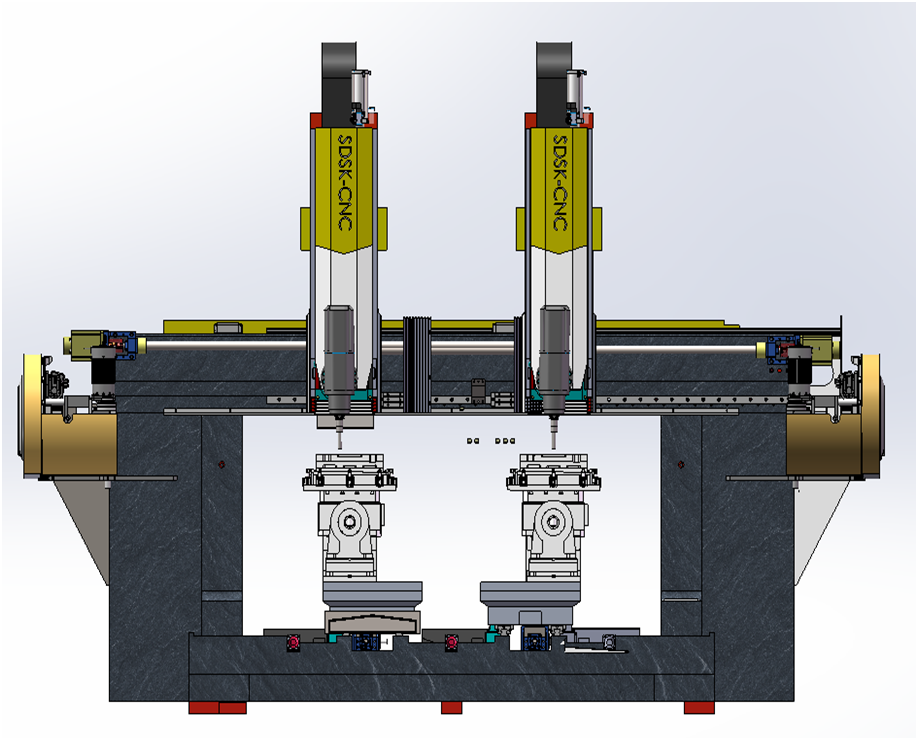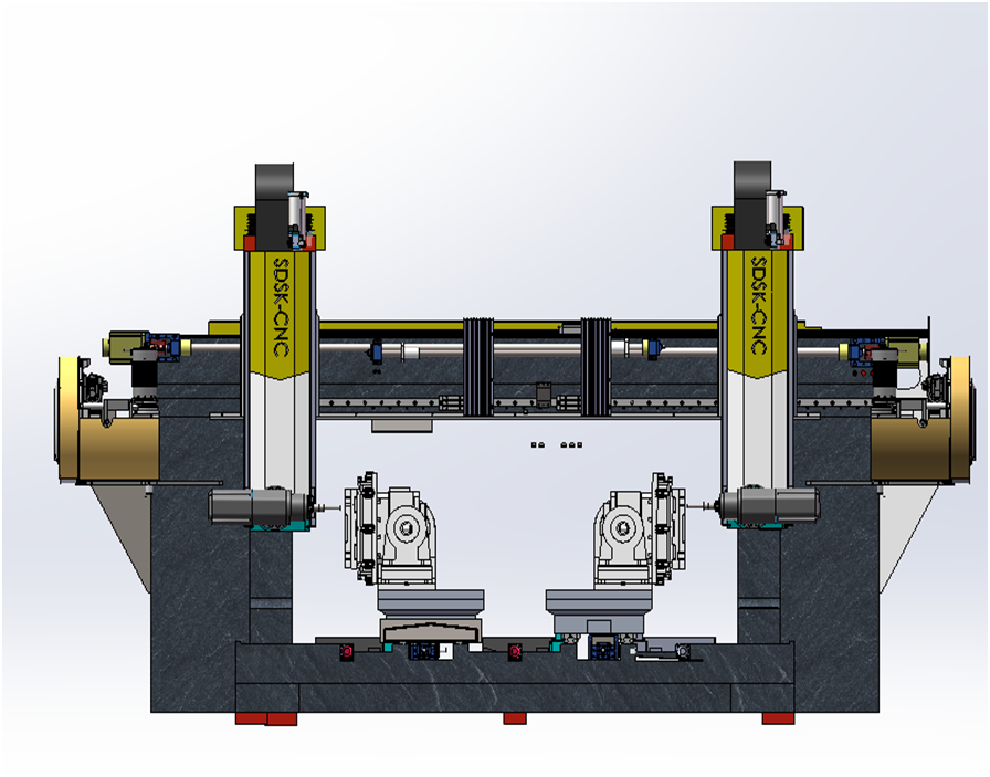 1SDSK1000WL-ZYB-2-BT40機(jī)型是專門為客戶量身定做的雙頭雙通道+雙主軸擺頭+雙五軸搖籃轉(zhuǎn)臺(tái)的專用六軸數(shù)控五面體龍門加工中心,定梁式龍門結(jié)構(gòu)。