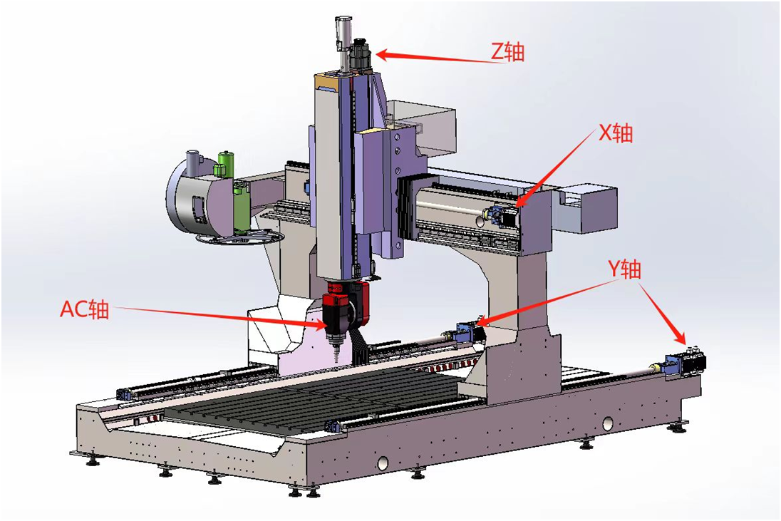- 運動方式為Y軸龍門前后運動,X軸機頭左右運動,Z軸主軸上下運動,A軸可±110·旋轉、C軸可±360·旋轉。