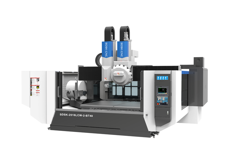 1. SDSK2518LCW-2-BT40機(jī)型是專門為客戶量身定制的立臥+C雙頭鉆攻機(jī),定梁式龍門結(jié)構(gòu);運(yùn)動(dòng)方式為X軸帶機(jī)頭上的臥軸和立軸同時(shí)左右運(yùn)動(dòng),Y軸工作臺(tái)前后運(yùn)動(dòng),Z1軸裝臥軸、Z2軸裝立軸,Z1Z2軸可單獨(dú)上下運(yùn)動(dòng),臥軸配有CC軸可±540·旋轉(zhuǎn),Z1軸臥軸+Z2軸立軸循環(huán)聯(lián)動(dòng)完成五體加工。